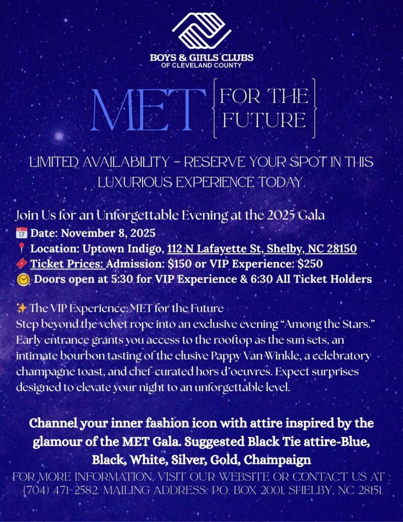EVENTS Purchase Ticket Make an impact with just one hour a week. Here at the Boys & Girls Clubs of Cleveland County, one hour a week is all it takes to impact not only the life of a child, but your own as well.